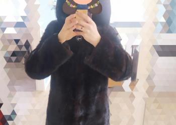 Шуба из норки,черная, с капюшоном, 48-50 размер, длина выше колена-середина бедра.