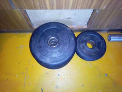 Четыре обрезиненных диска 15 кг - со стальной втулкой, посадочный диаметр 25 мм. Гриф 120 см (8 кг).