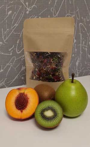 Черный фруктовый чай с персиком, грушей, киви, нежно дополнен цветками василька, апельсина и лепестками розы.