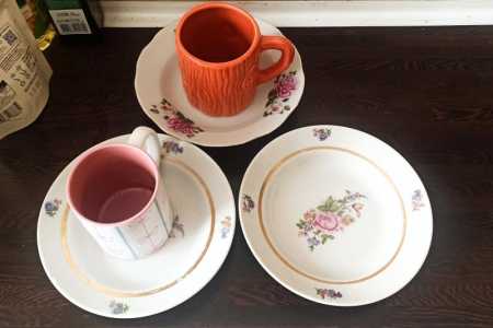 Три тарелки и две кружки. Две тарелки одинаковые. Отдаю все за 700 рублей. Посуда в хорошем состоянии. Кружки новые.