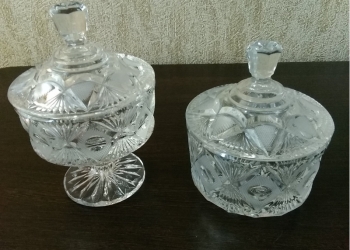Конфетницы хрустальные, новые, стояли в серванте для красоты. Одна конфетница на ножке , обе конфетницы с крышкой.